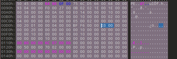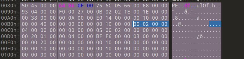 该文件属性为27 00即0x27 = 0b0010 0111,对应IMAGE_FILE_RELOCS_STRIPPED, IMAGE_FILE_EXECUTABLE_IMAGE, IMAGE_FILE_LINE_NUMS_STRIPPED, IMAGE_FILE_LARGE_ADDRESS_AWARE
