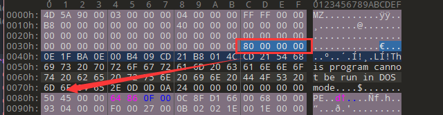 第37-40字节的值(小端序)0x80指向PE头。