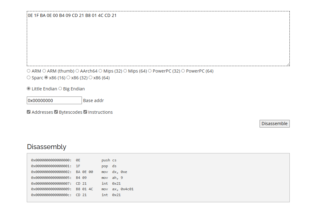 1 2 3 4 5 6 7 0x0000000000000000: 0E push cs 0x0000000000000001: 1F pop ds 0x0000000000000002: BA 0E 00 mov dx, 0xe 0x0000000000000005: B4 09 mov ah, 9 0x0000000000000007: CD 21 int 0x21 //print 0x0000000000000009: B8 01 4C mov ax, 0x4c01 0x000000000000000c: CD 21 int 0x21 //exit