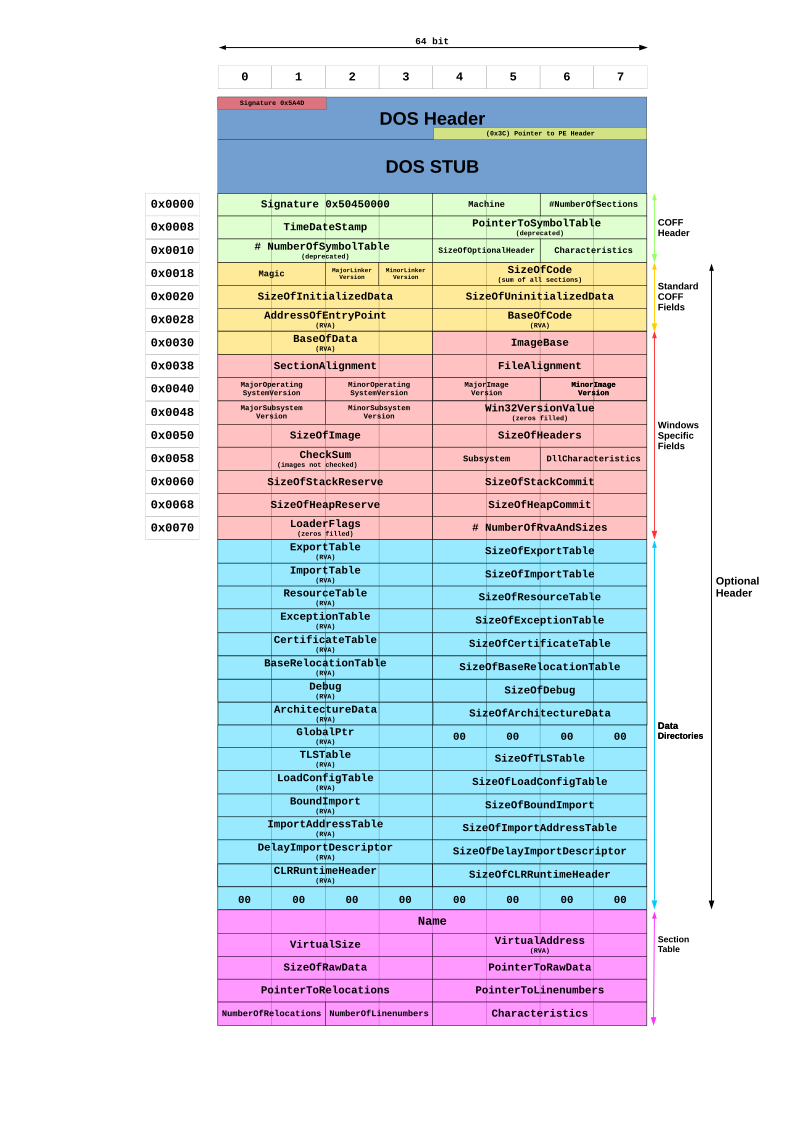 1 2 3 4 5 6 7 8 9 10 11 12 13 14 15 16 17 18 19 20 21 22 23 24 25 26 27 28 29 30 31 32 33 34 35 36 37 38 39 40 41 42 43 typedef struct _IMAGE_OPTIONAL_HEADER { WORD Magic; BYTE MajorLinkerVersion; BYTE MinorLinkerVersion; DWORD SizeOfCode; DWORD SizeOfInitializedData; DWORD SizeOfUninitializedData; DWORD AddressOfEntryPoint; DWORD BaseOfCode; DWORD BaseOfData; DWORD ImageBase; DWORD SectionAlignment; DWORD FileAlignment; WORD MajorOperatingSystemVersion; WORD MinorOperatingSystemVersion; WORD MajorImageVersion; WORD MinorImageVersion; WORD MajorSubsystemVersion; WORD MinorSubsystemVersion; DWORD Win32VersionValue; DWORD SizeOfImage; DWORD SizeOfHeaders; DWORD CheckSum; WORD Subsystem; WORD DllCharacteristics; DWORD SizeOfStackReserve; DWORD SizeOfStackCommit; DWORD SizeOfHeapReserve; DWORD SizeOfHeapCommit; DWORD LoaderFlags; DWORD NumberOfRvaAndSizes; IMAGE_DATA_DIRECTORY DataDirectory[IMAGE_NUMBEROF_DIRECTORY_ENTRIES]; } IMAGE_OPTIONAL_HEADER32, *PIMAGE_OPTIONAL_HEADER32;